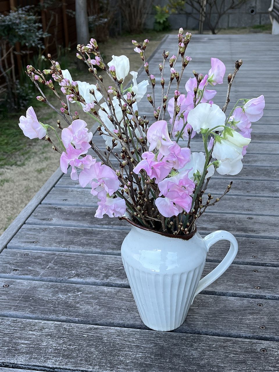 ごく淡いピンク色の桜に合わせて、スイートピーも優しいピンク色とホワイトをセレクトしました✨