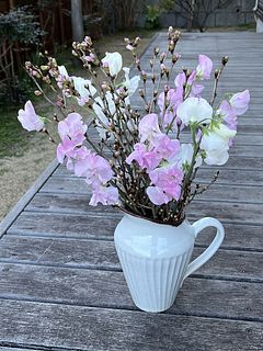 啓翁桜を9〜10本、スイートピーを7本、合計16〜17本お届けします。2束まとめて飾っても、それぞれに分けて飾るのもおすすめ。
