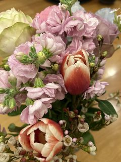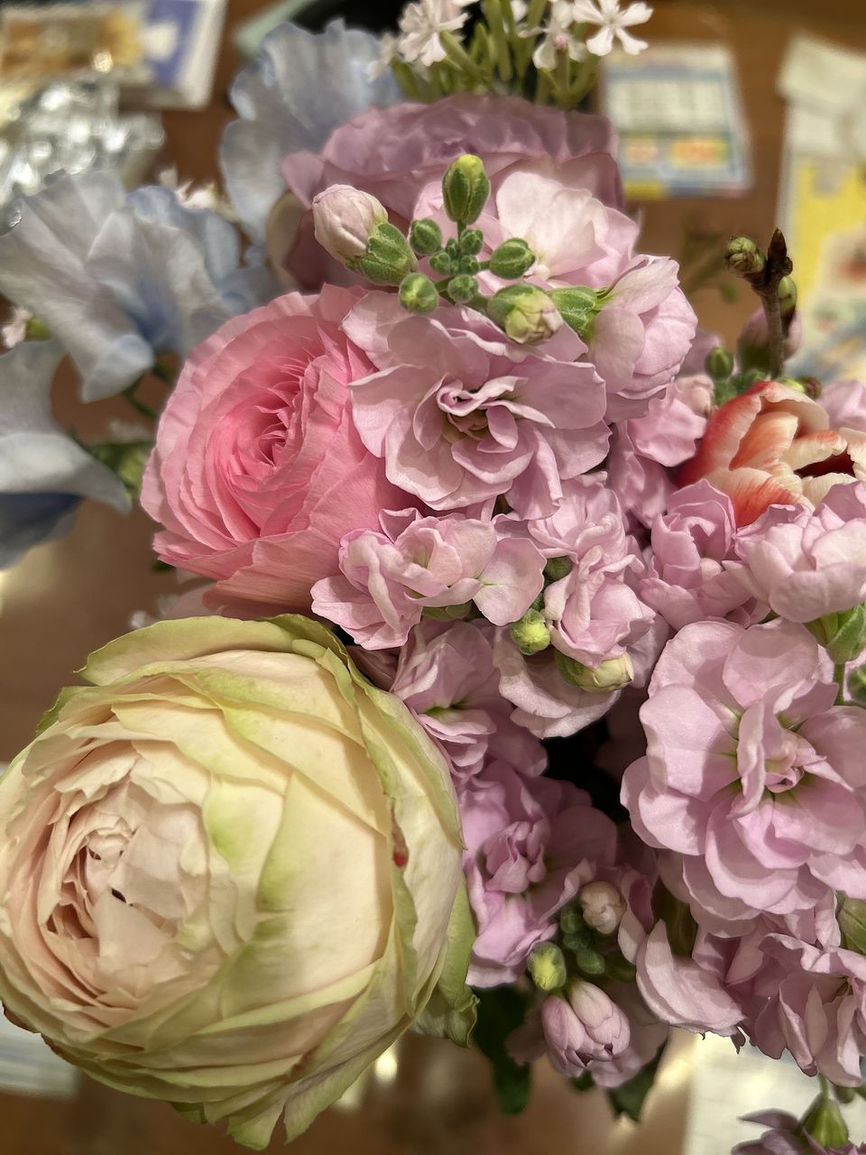 ころんとしたキュートなバラに桜や旬のチューリップなどをギュッと集めました🌷