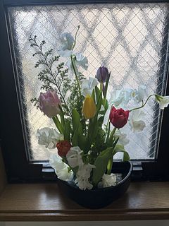 チューリップとホワイトスイートピーが主役の贅沢な春のおまかせブーケはいかが。かわいい組み合わせでお届けします。