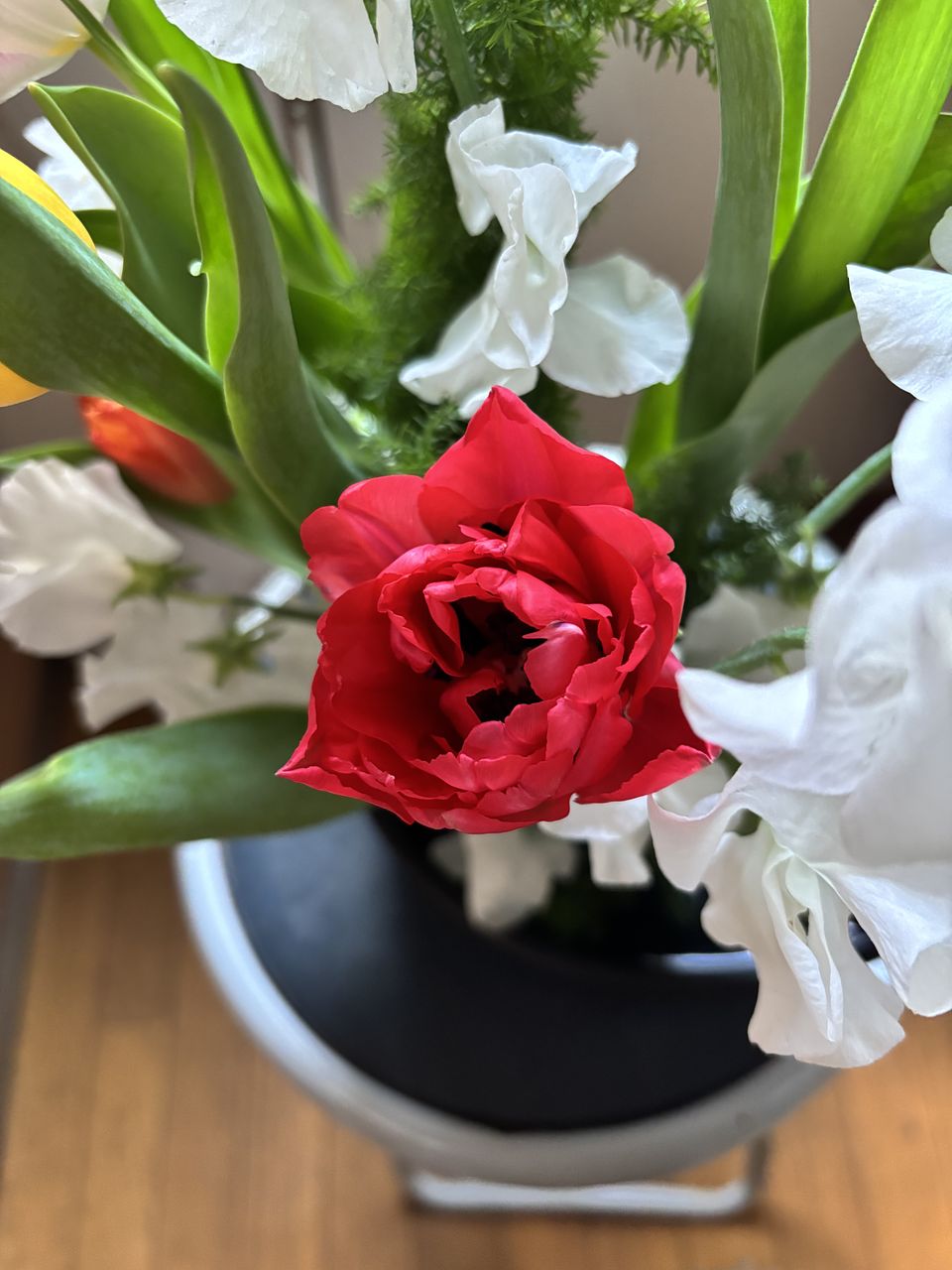 チューリップたちと雪のように真っ白なスイートピーとの組み合わせが魅力のブーケです。