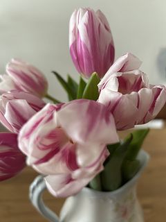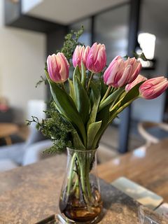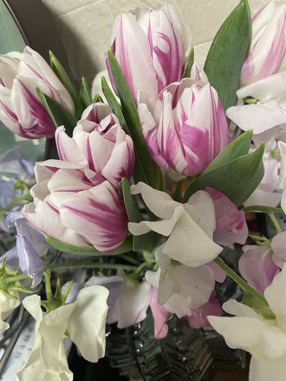 可愛いすぎた。今年はチューリップリレーをしてしまいそうです。この可愛さはおかわり級🙏💓💓 シャッキシャキの葉っぱで新鮮。 お花にまだ緑が残ってる感じがツボです。 少し短めがテーブルブーケに良い高さでした💓