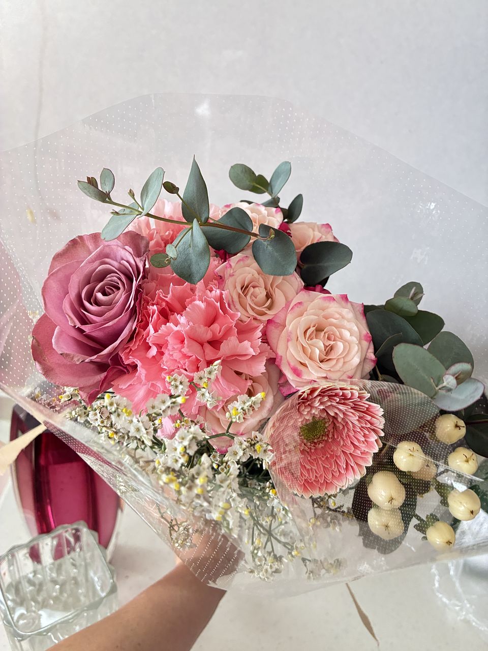 スプレーバラはボリュームあり可愛かったです。 カーネーション2本のうち1本が花のすぐ下のところで折れてたのと、ユーカリが反対になってた(枝先の部分に保湿ゼリーがベッタリ)のが残念でした。 ヒペリカムが入ると少し和な感じになるので、別にしました。