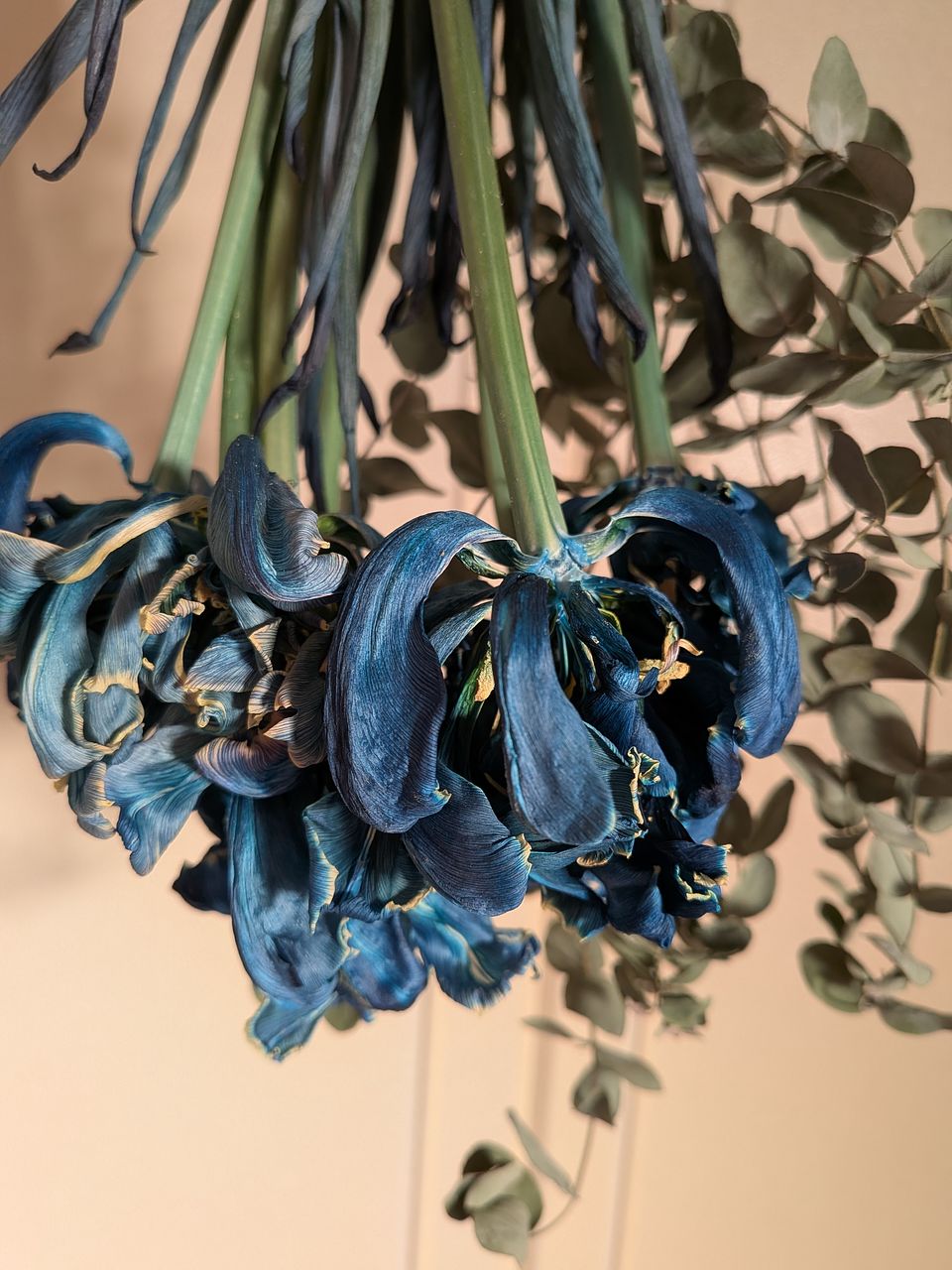 染料の影響により、葉の先端が青く染まっています。染めチューリップの特性であり、品質には問題ありません。花に水がしっかり届くよう、葉っぱは出来るだけ取り除いてしまいましょう。※写真は別の品種です