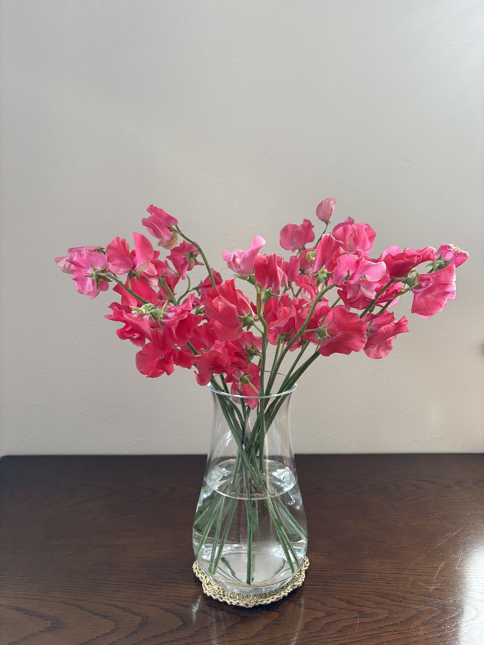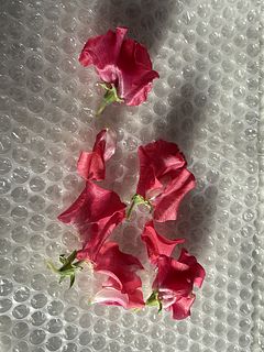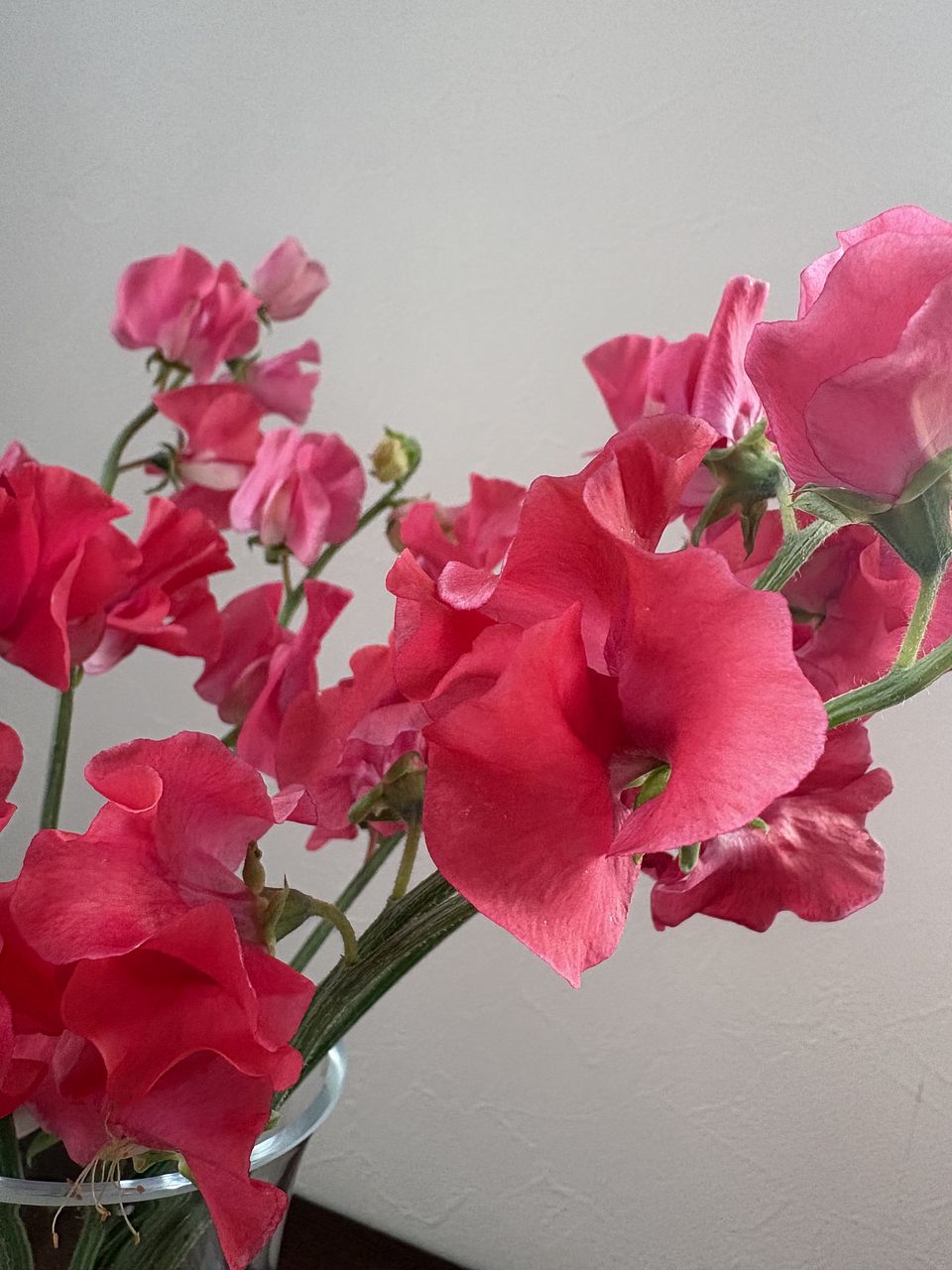 直前に連絡がありましたが、2本は濃いピンクのスイトピーでした。 赤いスイトピーからはほのかに甘い香りがして、香りと花の両方で癒されます。 日持ちもしてくれるようお手入れいたいと思います。