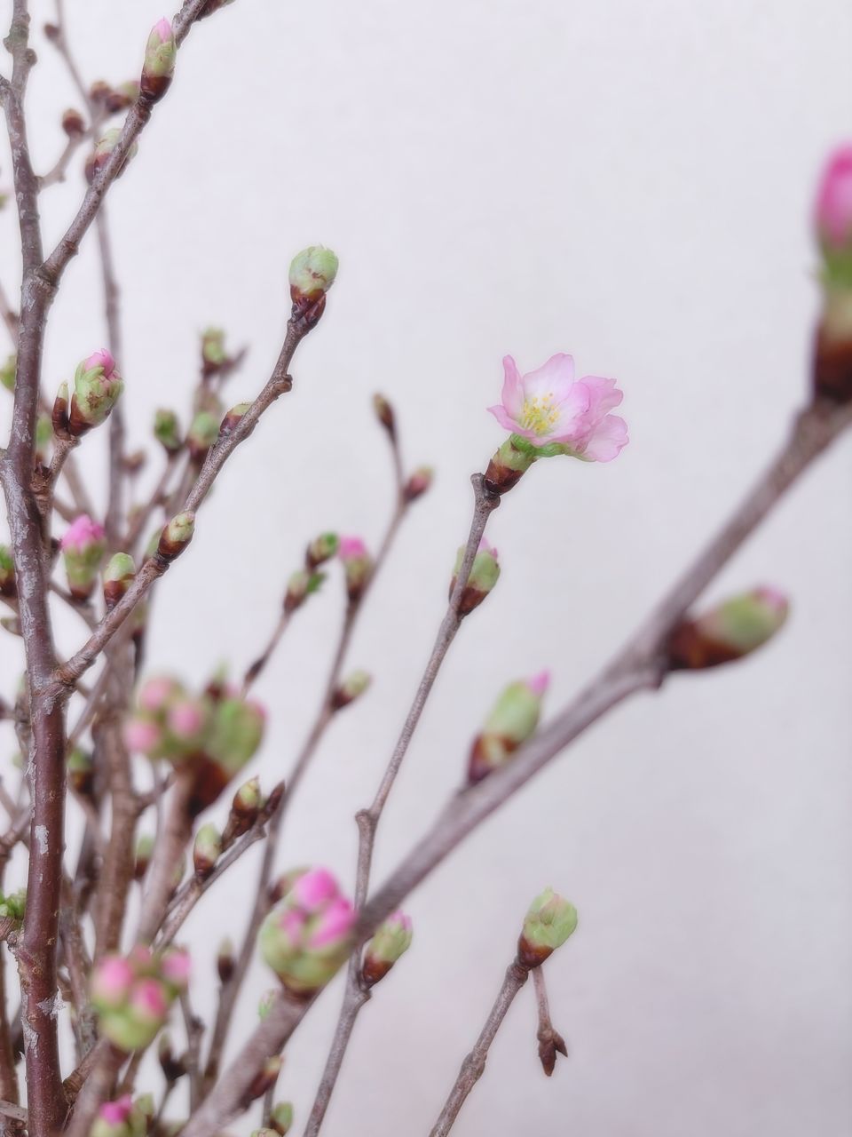たくさんの蕾が付いた桜が届きました。 部屋の中が暖かいので、少しずつ開いて可愛いピンクが目立ち始めました。 毎日楽しみです♪