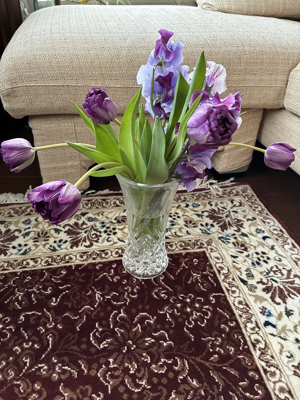 淡い紫を中心に丸みのあるチューリップとふんわり軽やかなスイートピー。