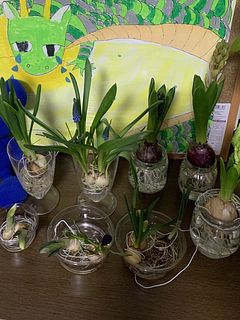 成長が早くいつ花が咲くのか楽しみです。 初めはキッチンの出窓に並べていたのですが、ちょっと寒い様なので、東の出窓の小学一年生の孫が描いた絵の前に並べました。 最近届いたミニ球根アソートも一緒です。