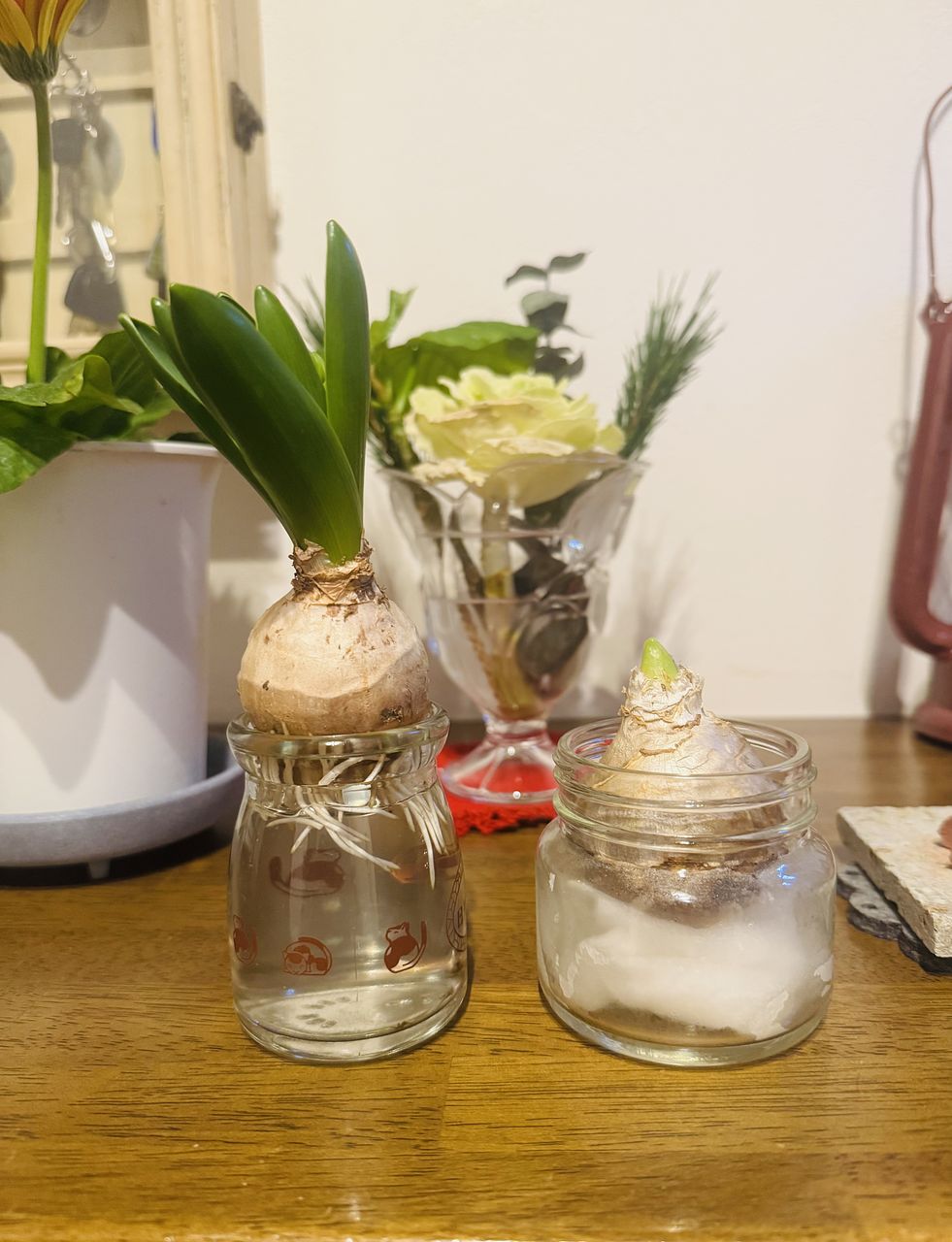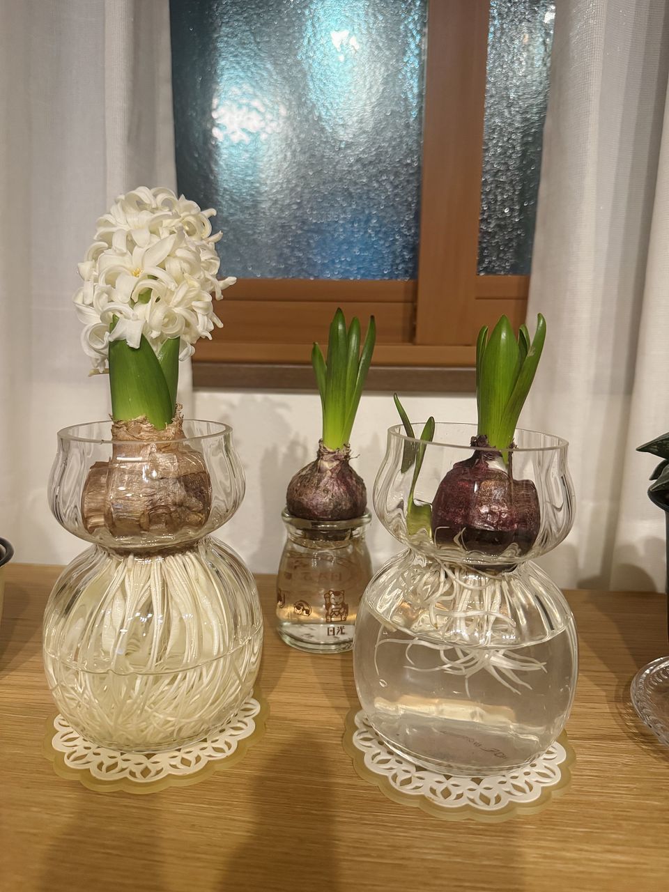 根が思ったよりも短く、下ではなく横に出ているものが多く、ガラス瓶を選ぶのが大変でした。前から家で育てていたヒヤシンスの花と比べると分かりやすいかと思います。これからの成長を楽しみにしています。花が咲くと、とてもいい香りがする🪻大好きな花です。