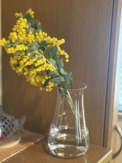 思ったよりボリュームが無かったので庭のユーカリを足しました。最初に届いた時はふわふわに咲いてる枝二本とすでに小さくなっている枝一本だったのでせっかくなら全部ふわふわの枝が欲しかったです。自分で花屋で買うならふわふわを選ぶと思うので。