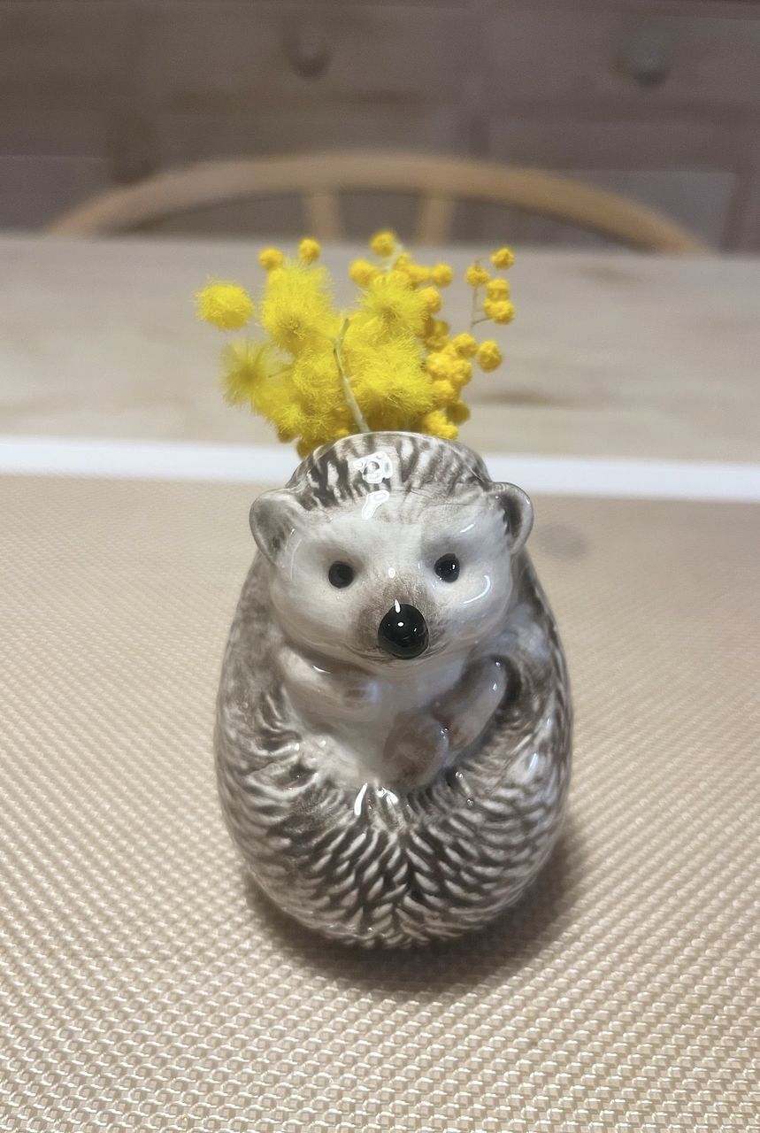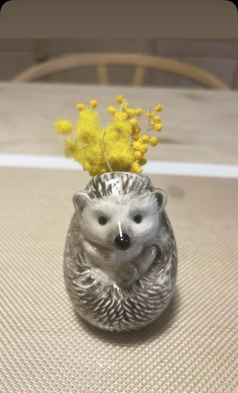むかし庭に植えて大きな木になったことがあったミモザ、2回植えて2回とも強風に倒れてしまい 以来直植えするのはやめてしまいましたが 懐かしくて注文しました。 家でも切り花にするとすぐにカリカリになっていたのでわかってはいましたが 4本中ふわふわのものが1本、他3本はつぶつぶで やはり残念に思いました🥲 でもどっちみちあっという間に小さくなるしな〜と。 やってみたかったハリネズミさんに挿してみました。 ハリネズミさんのおめめが小さくてリアルだったのでマジックで大きく描いてみました😊