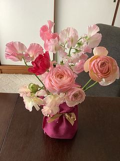 ボリュームはありませんが淡い色や香りが素敵な春の花束です