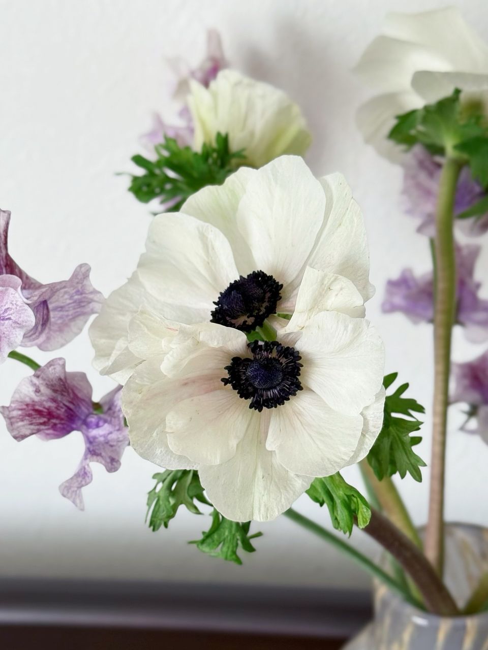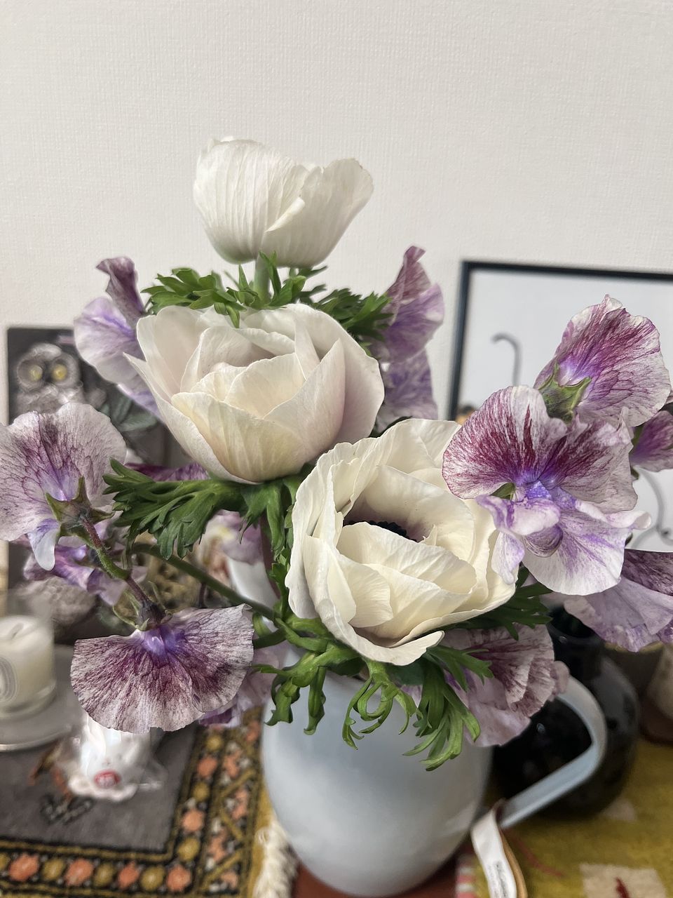 双子咲きのアネモネが入っていました🫶✨ スイートピーの色合いもオシャレですごく気に入りました💜🤍