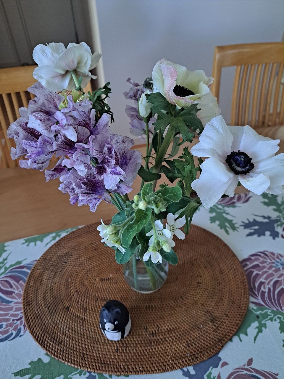 白いアネモネがまず華やかで美しかった。スイートピーの色がアネモネの中央の色とシンクロしていて一体感があった。スイートピーの香りは期待ほどではなかったのが惜しかった。