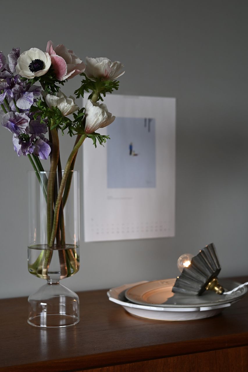 届いた時は花は閉じていましたが、水切りをして飾ってまもなく、アネモネが綺麗に開いて存在感たっぷりでした。 淡い紫色のスイートピーとアネモネの白、可愛い茎の緑が綺麗でした!