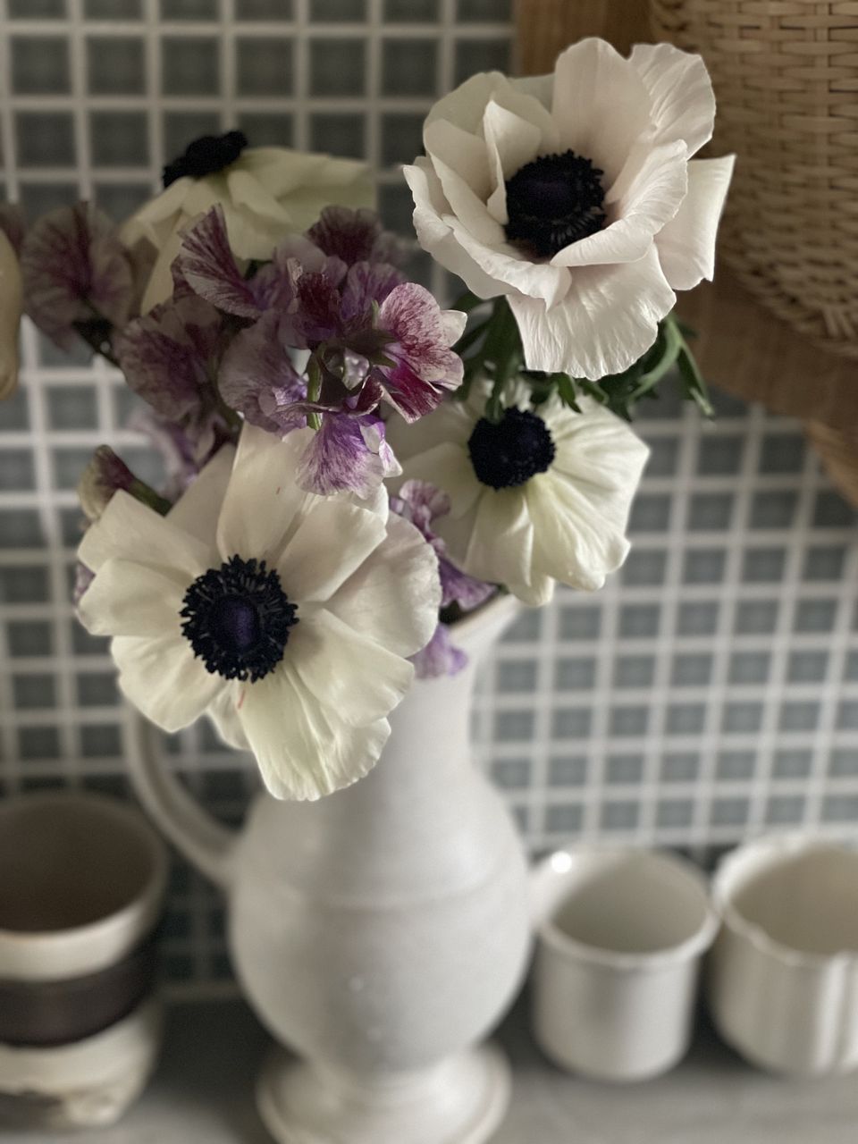 大好きなホワイトアネモネ❤️むらさきのスイートピーが素敵です‼️長く咲いてくれるようにお世話します😃