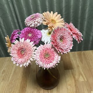 アプリコットピンクやコーラルピンク、ホワイトピンクなどニュアンスカラーのガーベラをギュッと束ねました🍑ころんとした咲き方が最高にキュート。