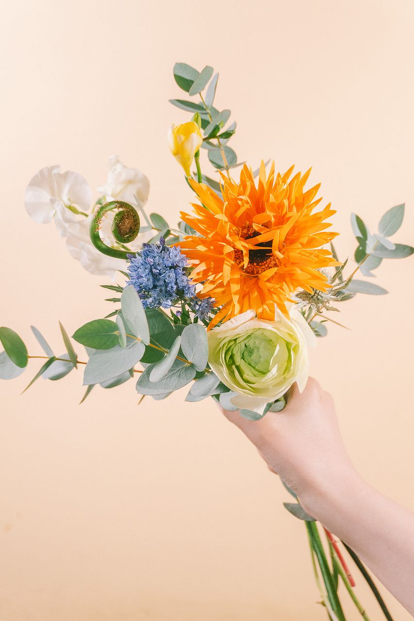 オレンジや黄色、くるくる姿がかわいいぜんまいを束ねた、見ているだけで、気分がふっと明るくなる色合わせです。