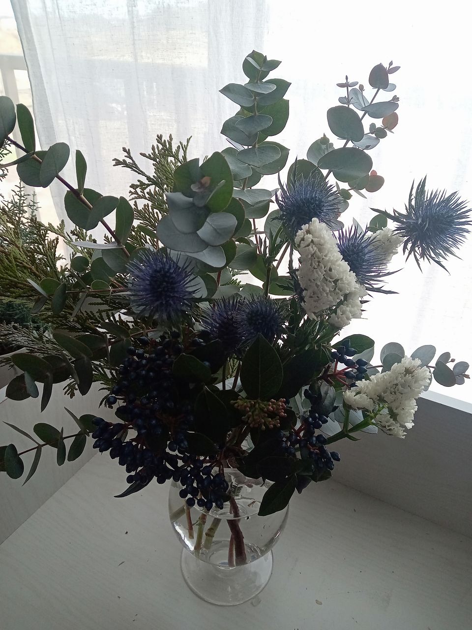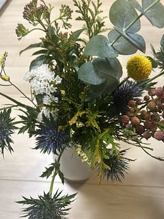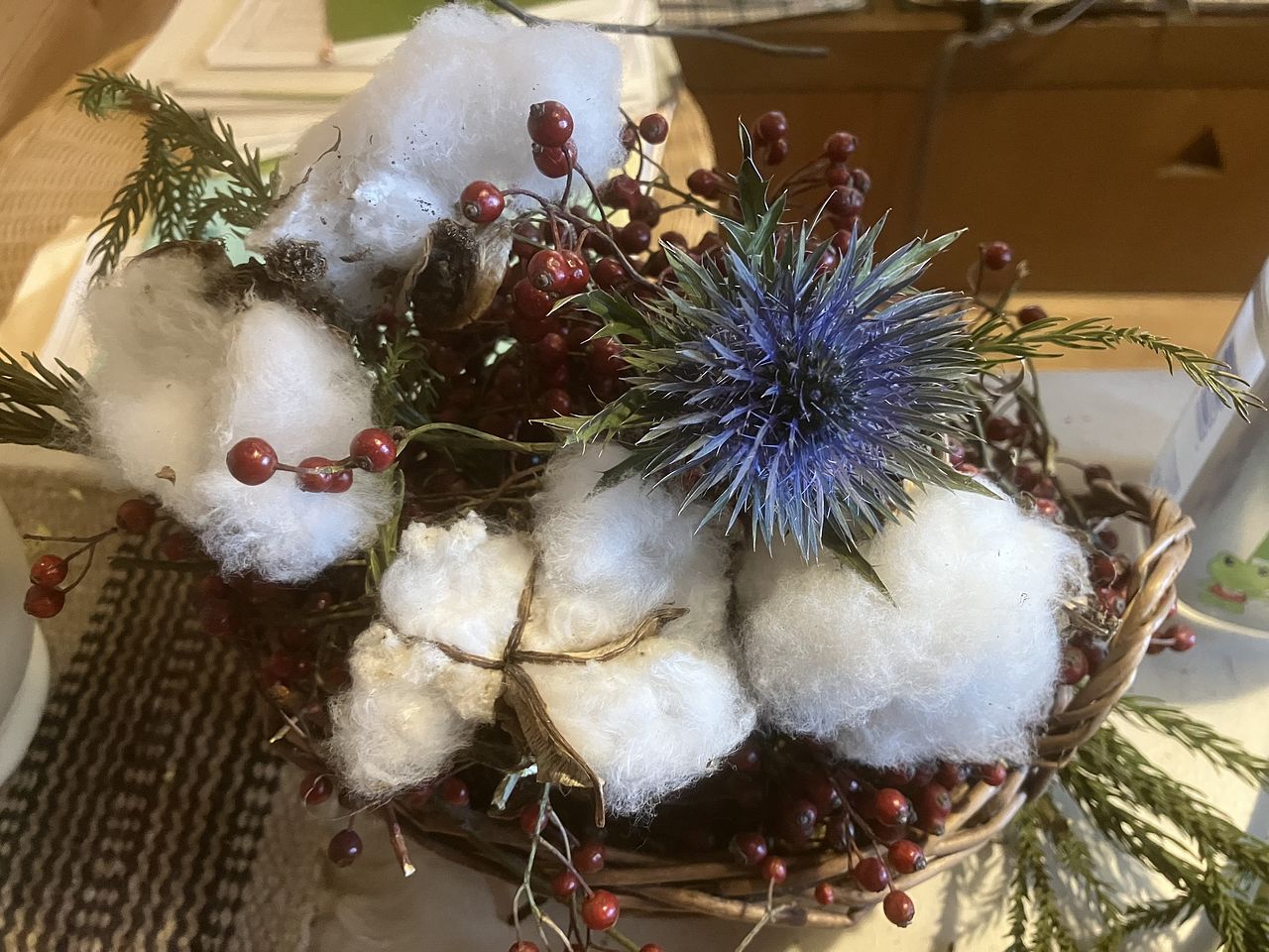 初めて購入しました。 白い花が想像より少ない感じでしたので手持ちの綿を加え杉も入れてスワッグにしました。いつもは(山に住んでいる)周辺の自然素材で作っています。春らしいスワッグを作りたくて購入しました。また注文したいと思います。折れていたエリンジウムはこのようにアレンジしました。