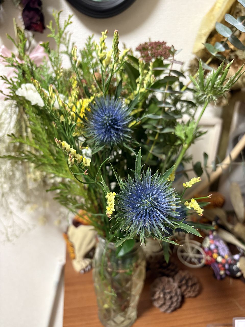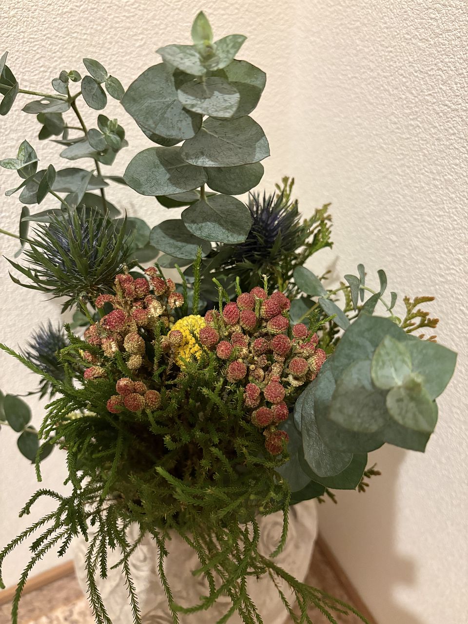 クラスペディアやバーゼリアが入っていたので、あたたかい色味もあり、ステキな組み合わせで嬉しかったです! 数日は花瓶で楽しみ、その後スワッグにしたいと思います☆