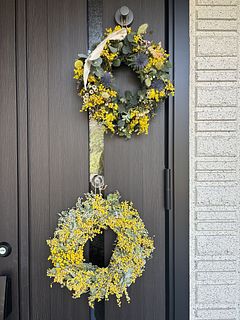 スギ?のような葉の植物の先のポンポンがドライにしたらポロポロ落ちてしまいました。 以前のミモザのスワッグの方が素敵でした。