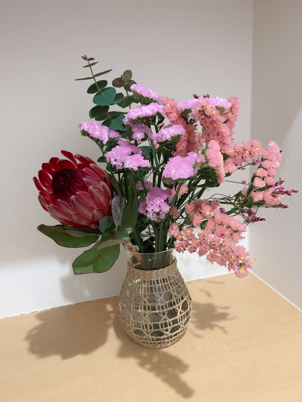 プロテアをメインにふわふわとピンクカラーがかわいいスターチスをたっぷりと添えて😍