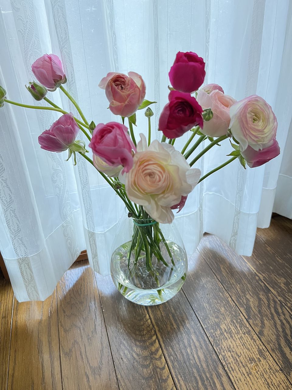 濃淡のバラエティ豊かなピンクのラナンキュラスをたっぷり束ねて。