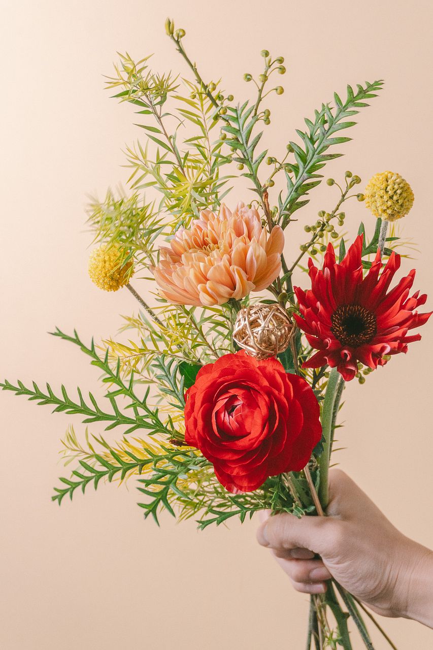 赤鬼をイメージした赤と黄色の花を中心に、豆をイメージした実物、枝物を添えた節分用のブーケです👹