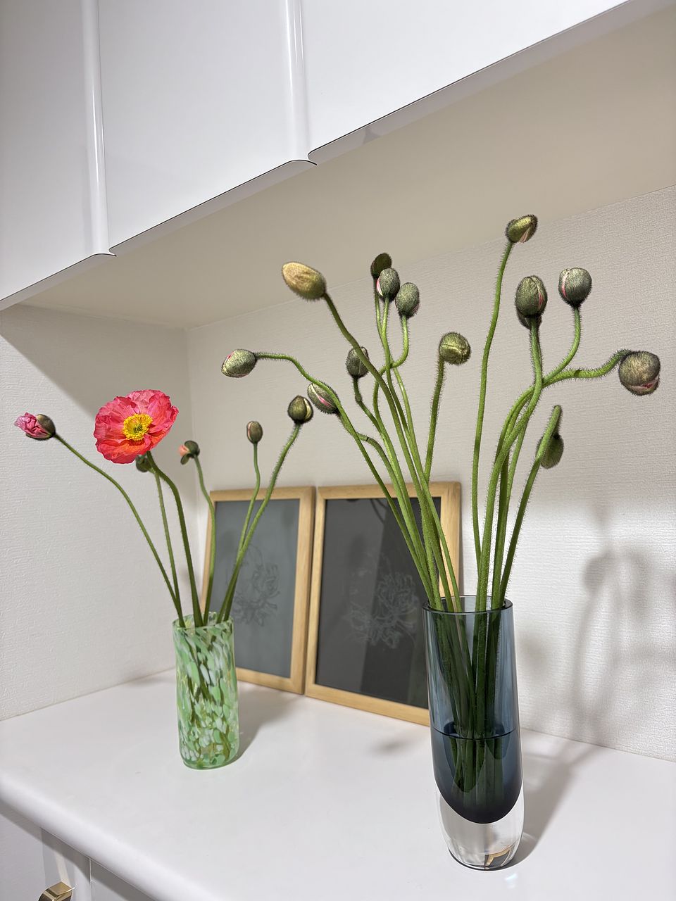 ポピーの季節がやってきました!おじぎをしたような蕾と、くしゃっとした花びらが愛らしいお花🌼