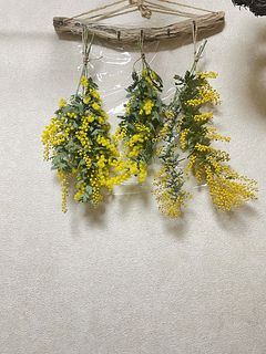 ふわふわの可愛いミモザが届きました! 配送途中で2本だけが軽〜くドライになってましたが比べずに見ると普通にとても可愛いミモザです🌼 早速ドライフラワーにするため吊るしてると良い匂いがしています♪