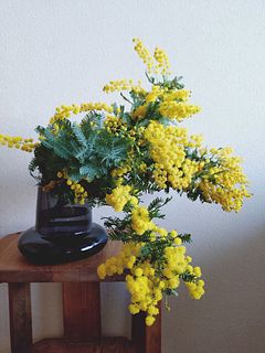 前回とは違う種類のミモザにしてみました。 とてもボリュームがあってゴージャスです。 ただ 細かな葉がポロポロ落ちて 動かすたびに お掃除が必要ですね~ でも満足です。