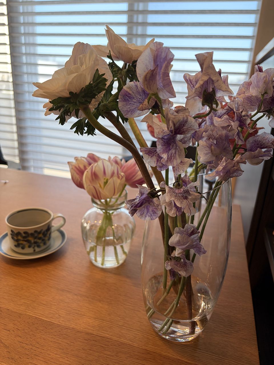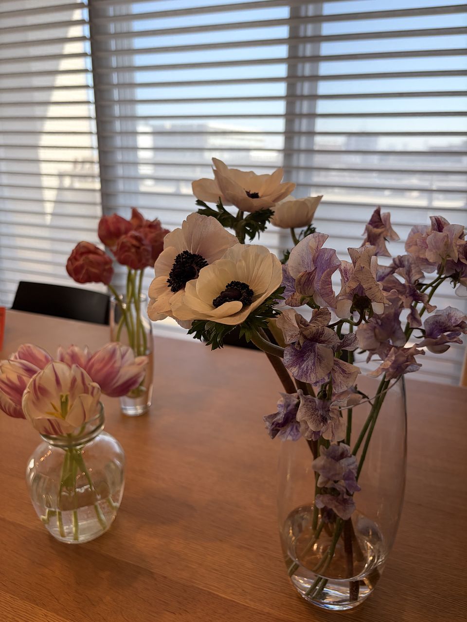 珍しいホワイトのアネモネ「ホワイトブラックセンター」と絞り染めのようなカラーリングが美しいスイートピー「詩かすみ」を贅沢に束ねて🦋