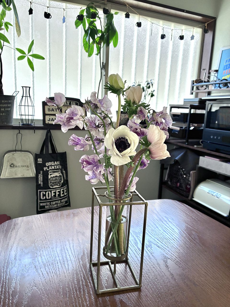 届いた時は花は閉じていましたが、水切りをして飾ってまもなく、アネモネが綺麗に開いて存在感たっぷりでした。 淡い紫色のスイートピーとアネモネの白、可愛い茎の緑が綺麗でした!