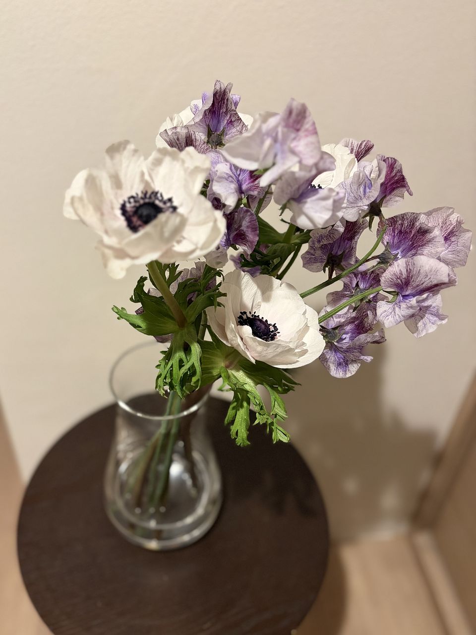 双子咲きのアネモネが入っていました🫶✨ スイートピーの色合いもオシャレですごく気に入りました💜🤍