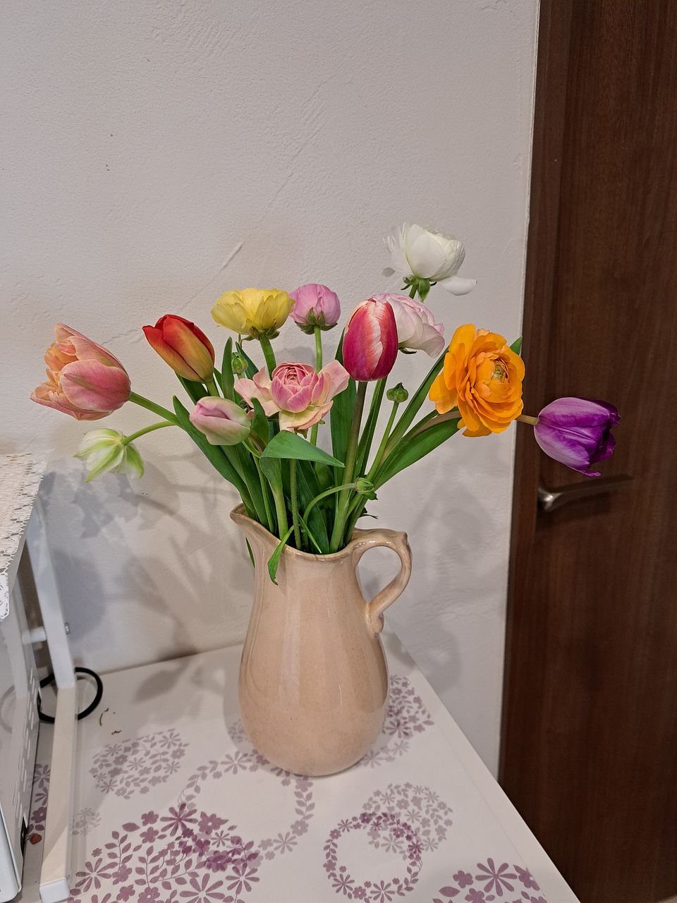 大好きなラナンキュラスが出るのを待ってました!チューリップも種類か混ざっていて可愛いです。カラフルな組み合わせで、見る度に明るい気持ちになります。