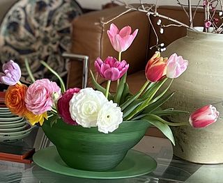 春らしいカラフルな色合いで、寒い日々でも心が温まるようです。チューリップとラナンキュラスの春の花で空間の彩りとして非常に満足しています