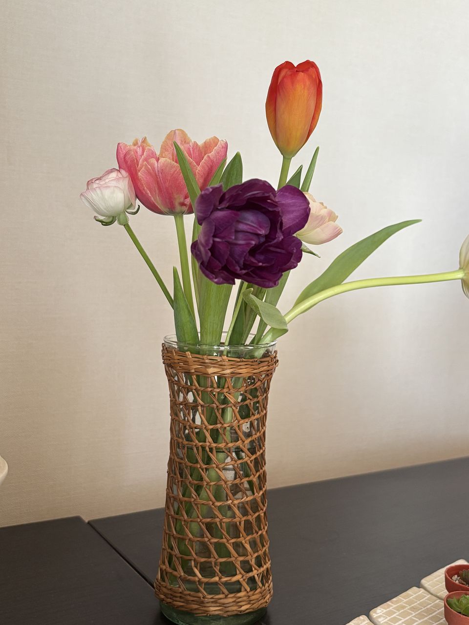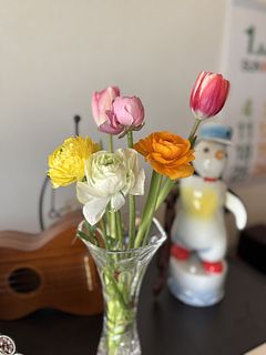 可愛いチューリップとラナンキュラスが届きました。色合いがとてもステキです。 以前FLOWERさんで購入した花瓶にベストマッチでした(^-^)/