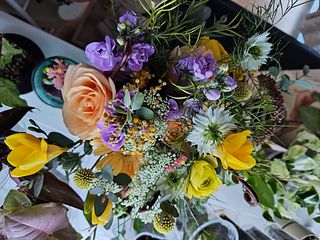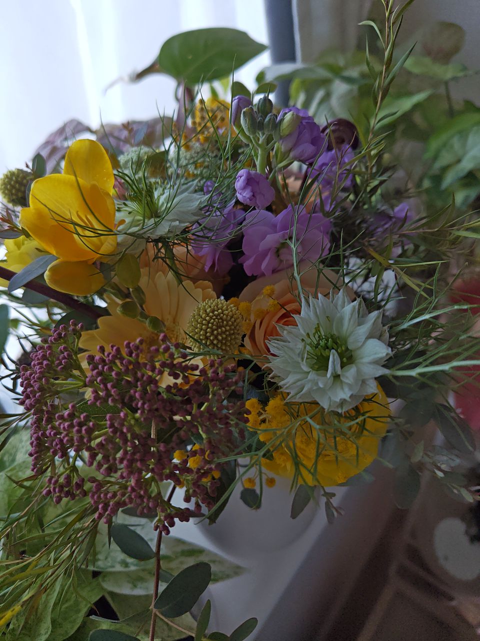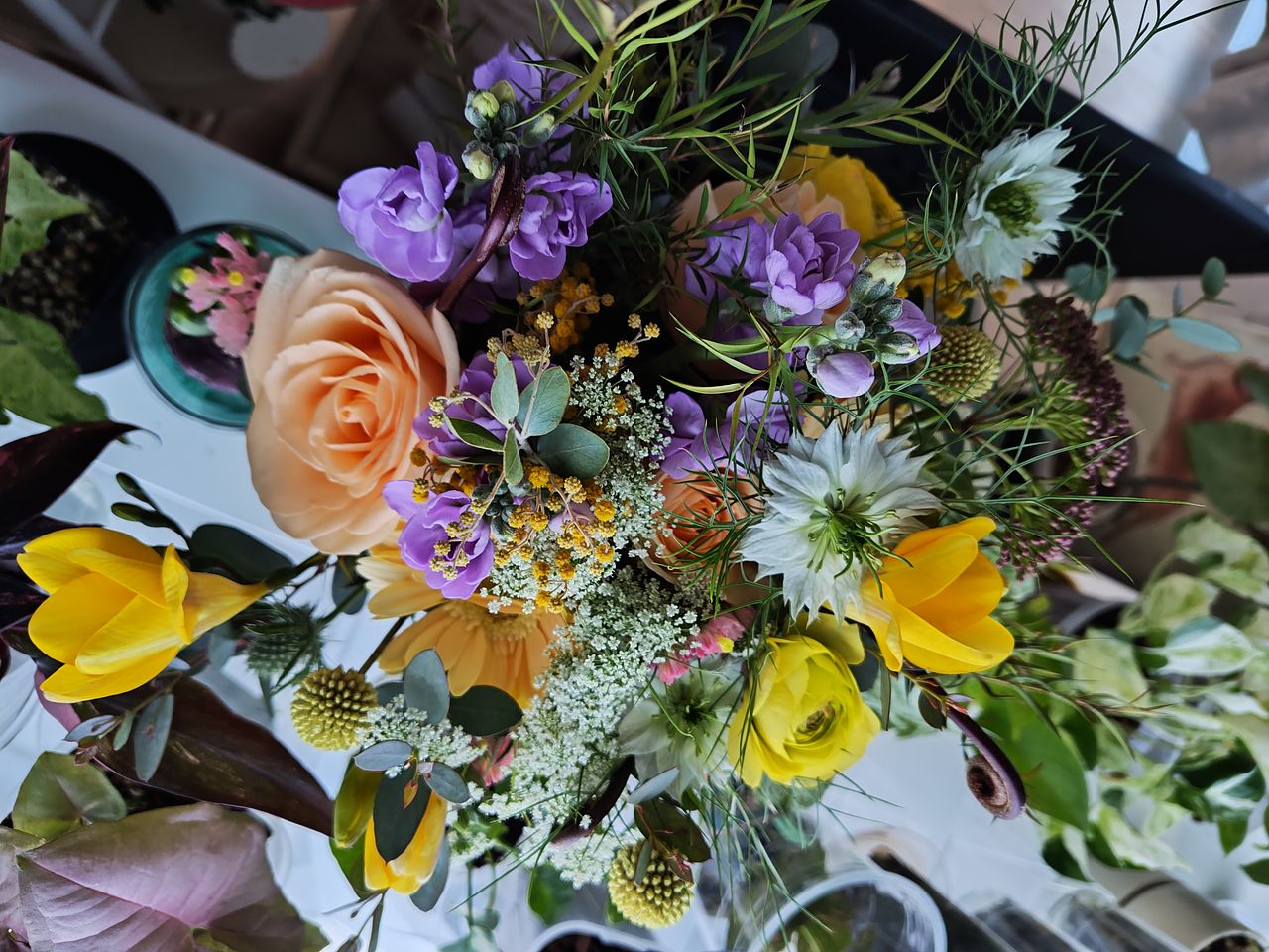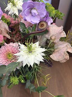 可愛らしいお花のなかに動きのある雪柳やゼンマイのようなクルリと巻いた山菜?!変わり種の植物がアクセントになって素敵でした💓
