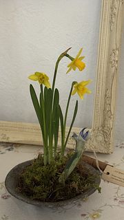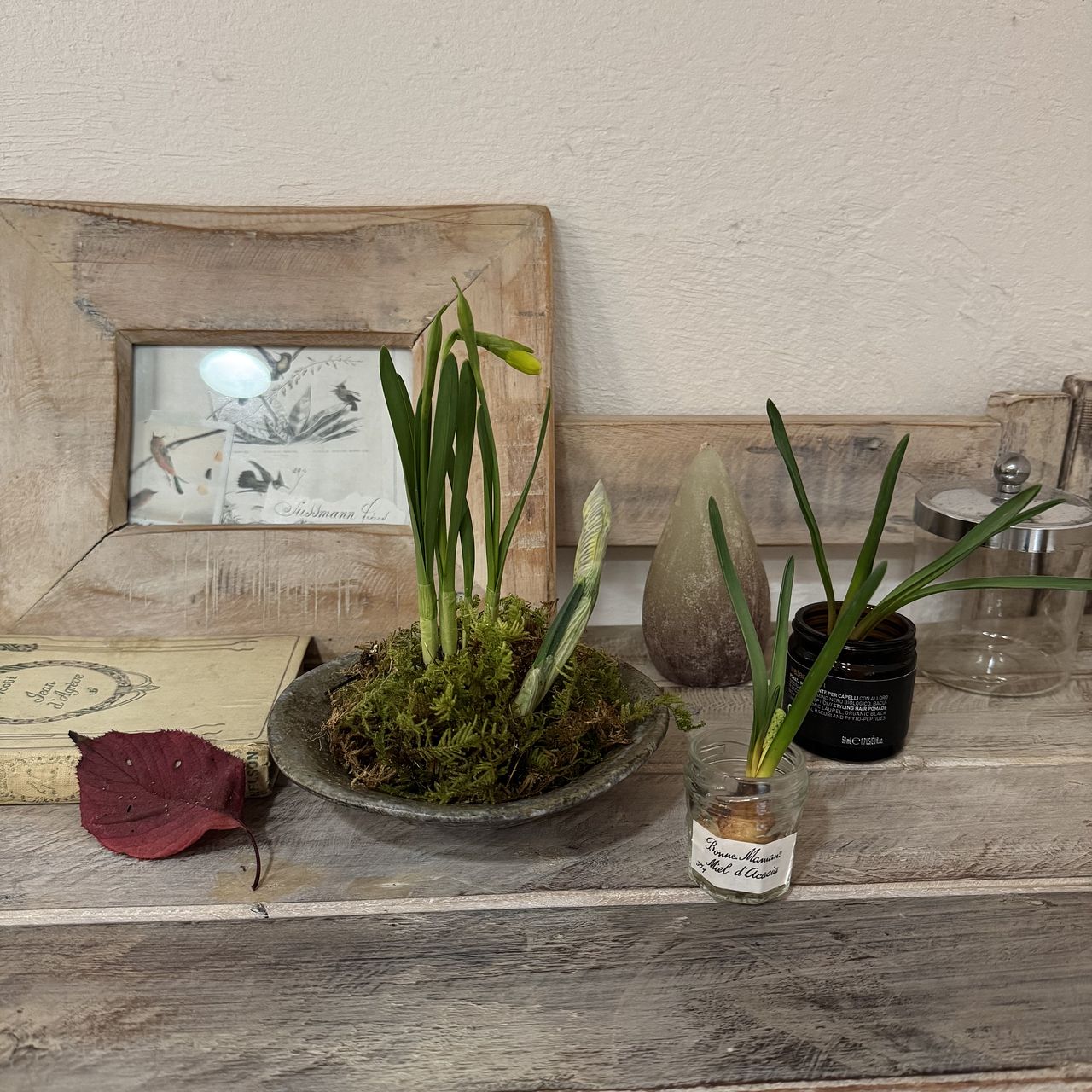 家にあったガラスボウルと盆栽用の植木鉢に苔を敷いて乾燥防止に上からも苔で覆い箱庭に。