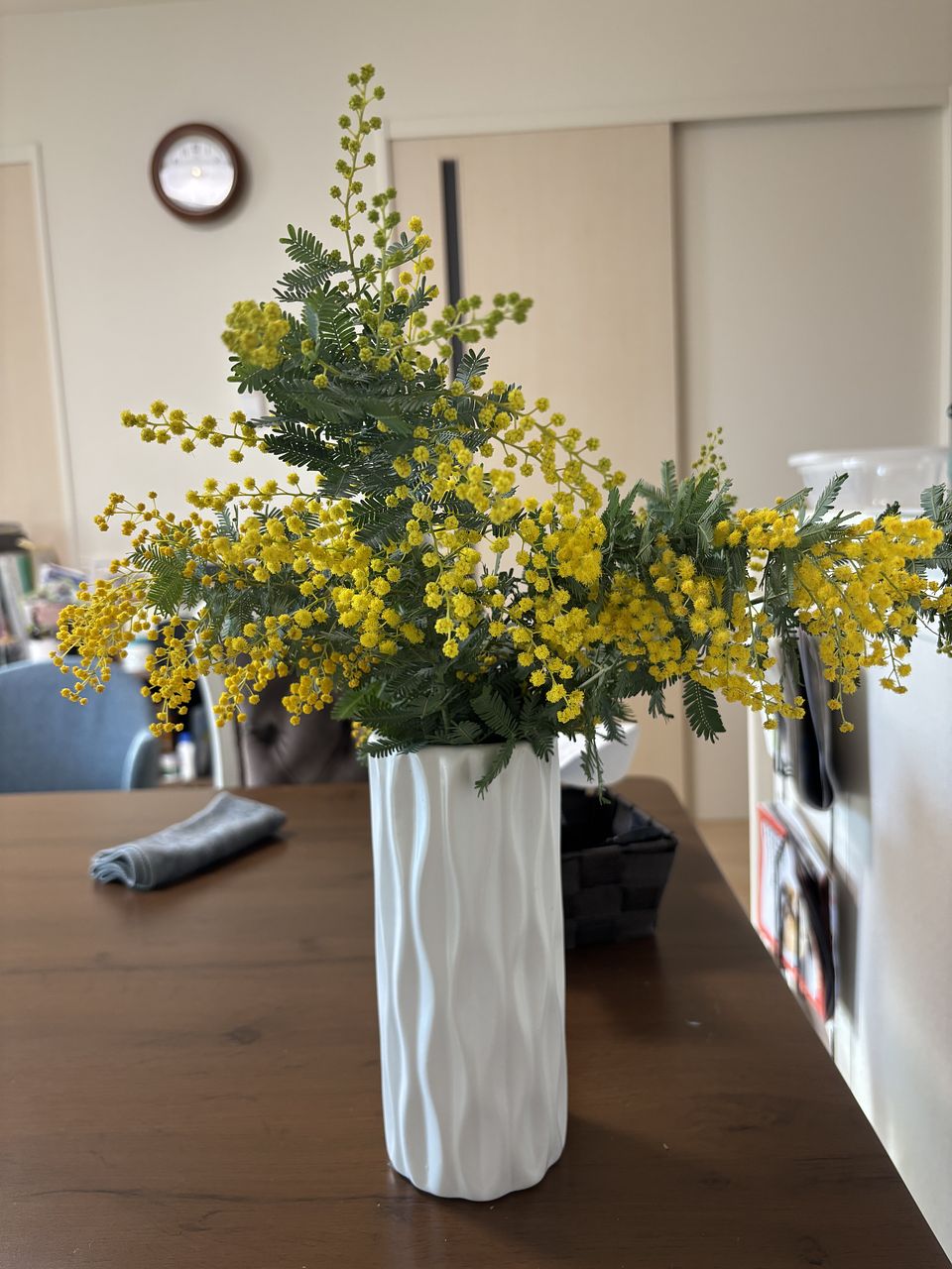 前回とは違う種類のミモザにしてみました。 とてもボリュームがあってゴージャスです。 ただ 細かな葉がポロポロ落ちて 動かすたびに お掃除が必要ですね~ でも満足です。
