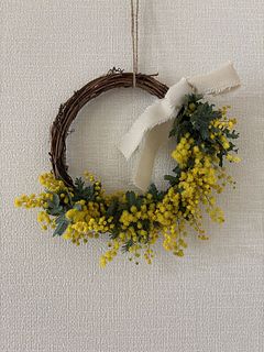 短めミモザが7本届きました。一部茶色でしたがリースにするのでそれほど気にならず。ふわふわミモザは1日限りでしたが、それもミモザの特性。手持ちのユーカリとリースにしました。満足です✨