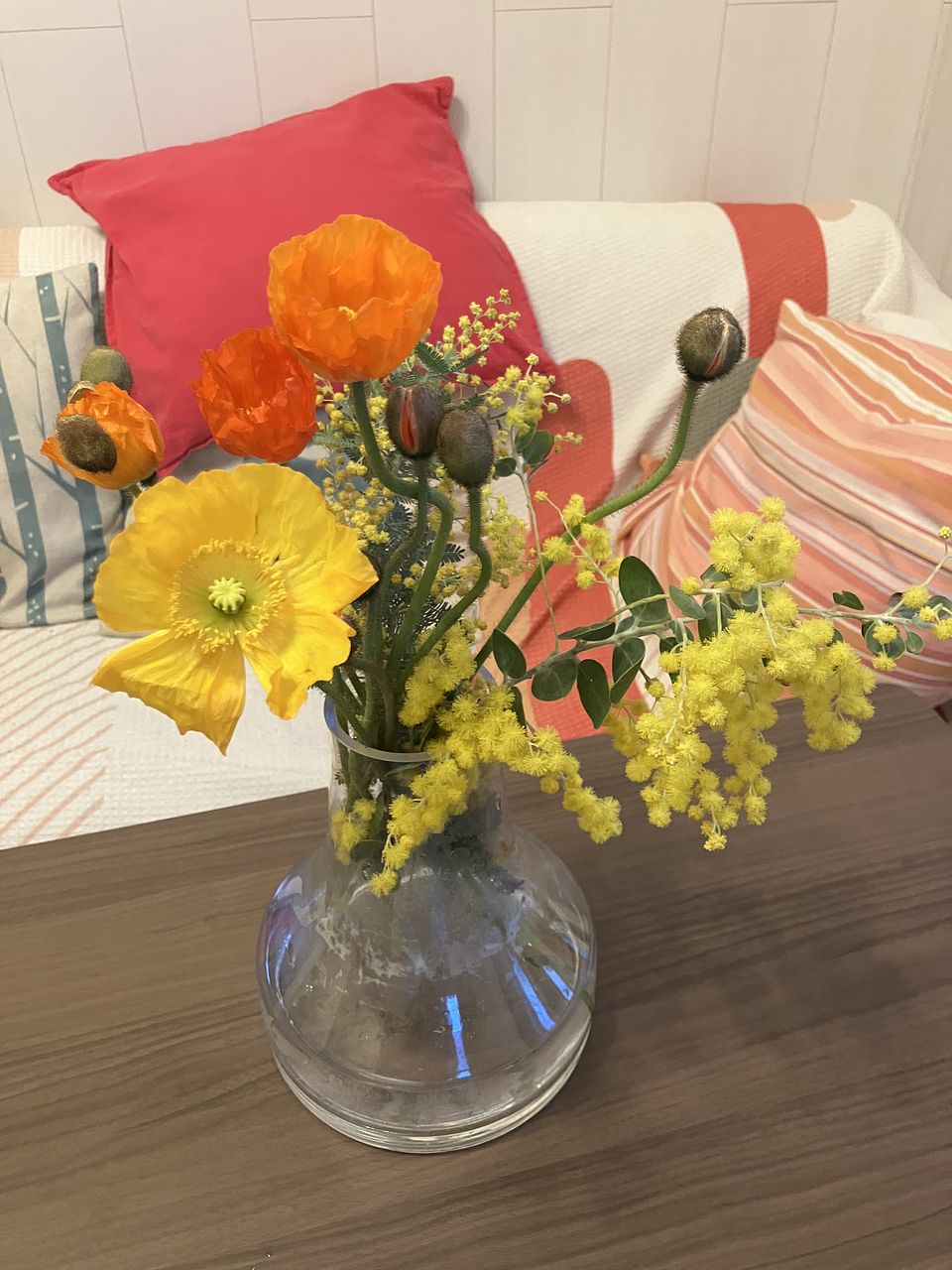 ミモザはきれいに咲いていてフワフワ、とても良い香りで可愛くてテンション上がりました。 ポピーは届いた時はみんなまだ蕾の状態で…1日経って咲き始めました。 ミモザとポピーは一緒ではなく別々に飾りました、それもアリかなと思います。