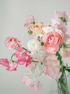 スイートピーの軽やかな花びらと、ラナンキュラスの幾重にも重なる花姿を束ねた、やさしいピンク色のブーケ🌸