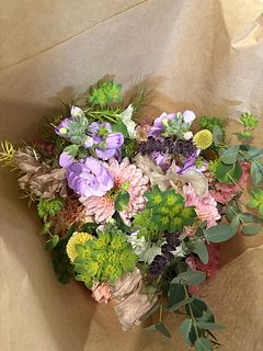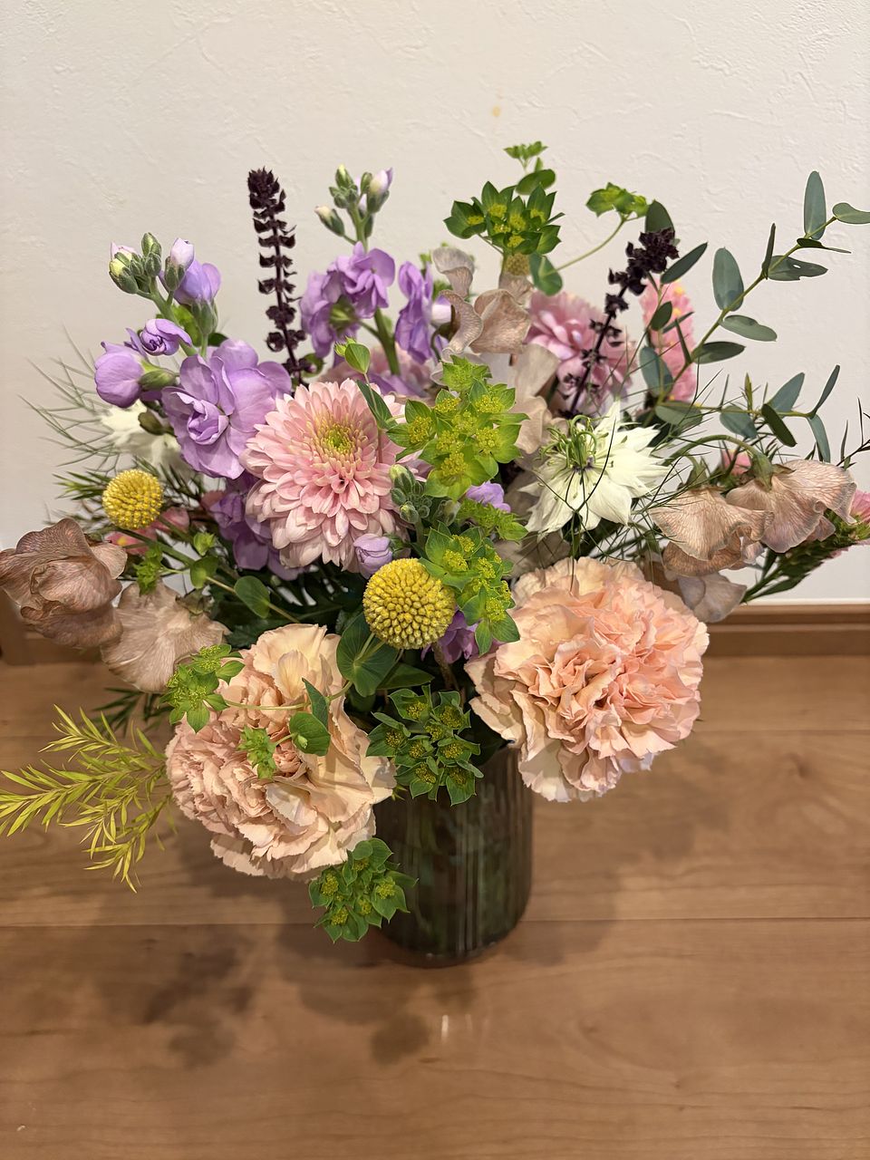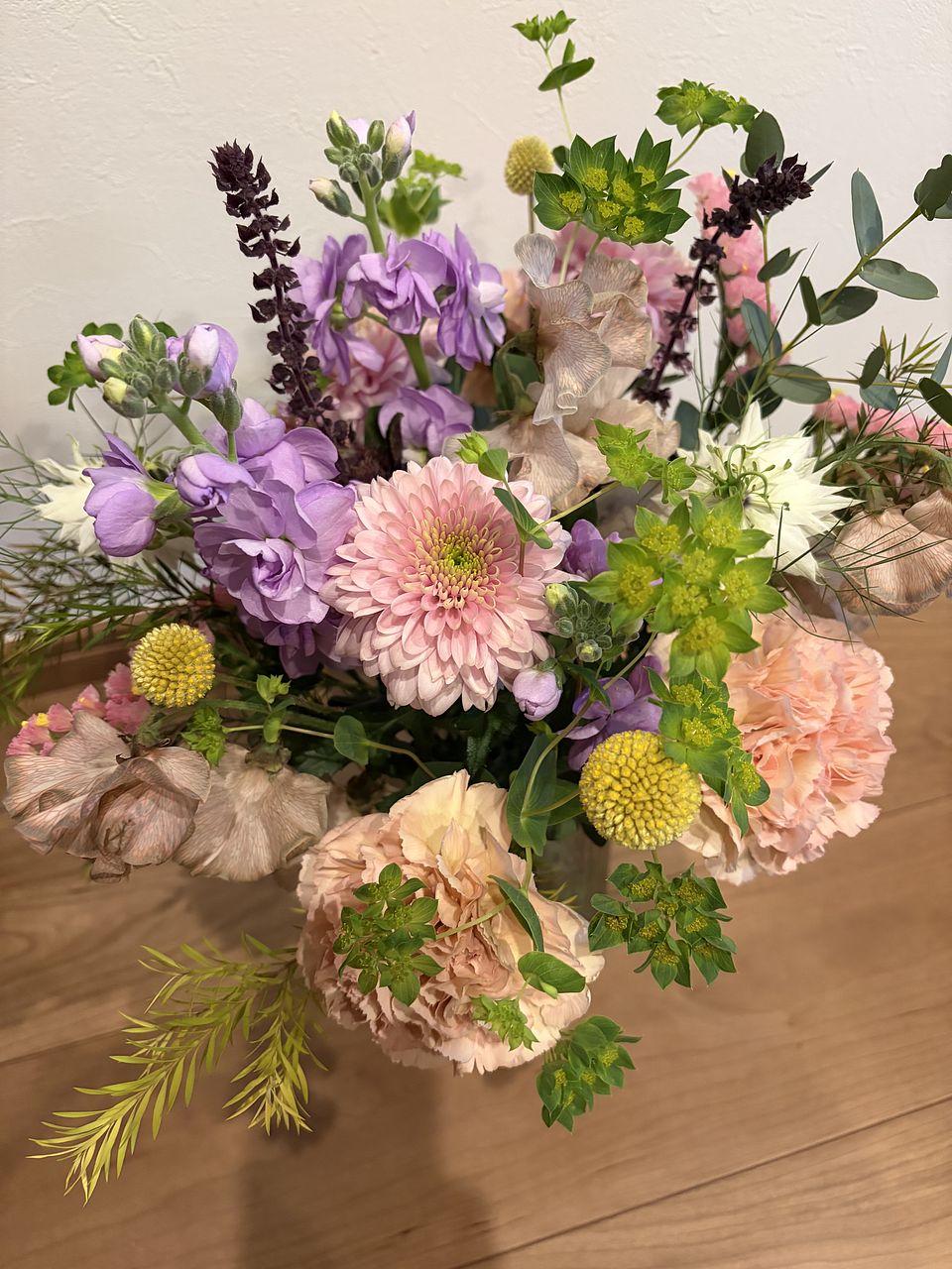 可愛らしいお花のなかに動きのある雪柳やゼンマイのようなクルリと巻いた山菜?!変わり種の植物がアクセントになって素敵でした💓