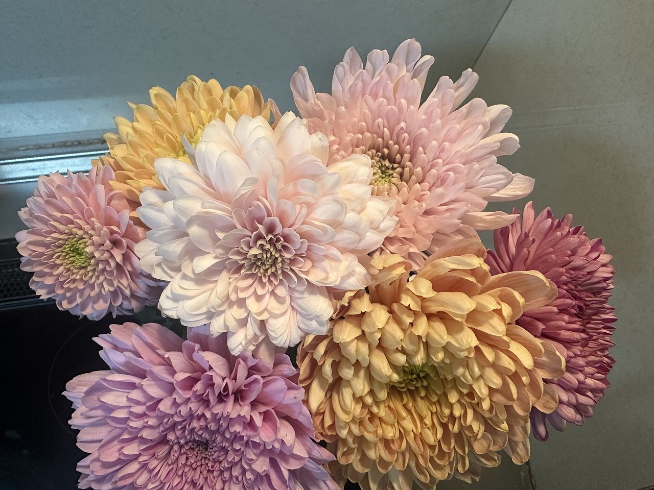 淡いペールトーンが魅力的な、希少品種の春色マムを贅沢に束ねたブーケ🌸
