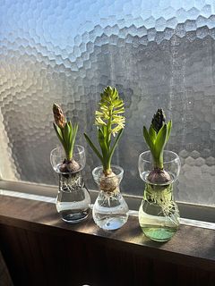 写真と違って、花の数が少なめ、色も思っていたものと違って、ちょっとがっかりです。調べてみたら、写真とは品種が違うヒヤシンスのようでした💦😭でも、大切に育てたいです。