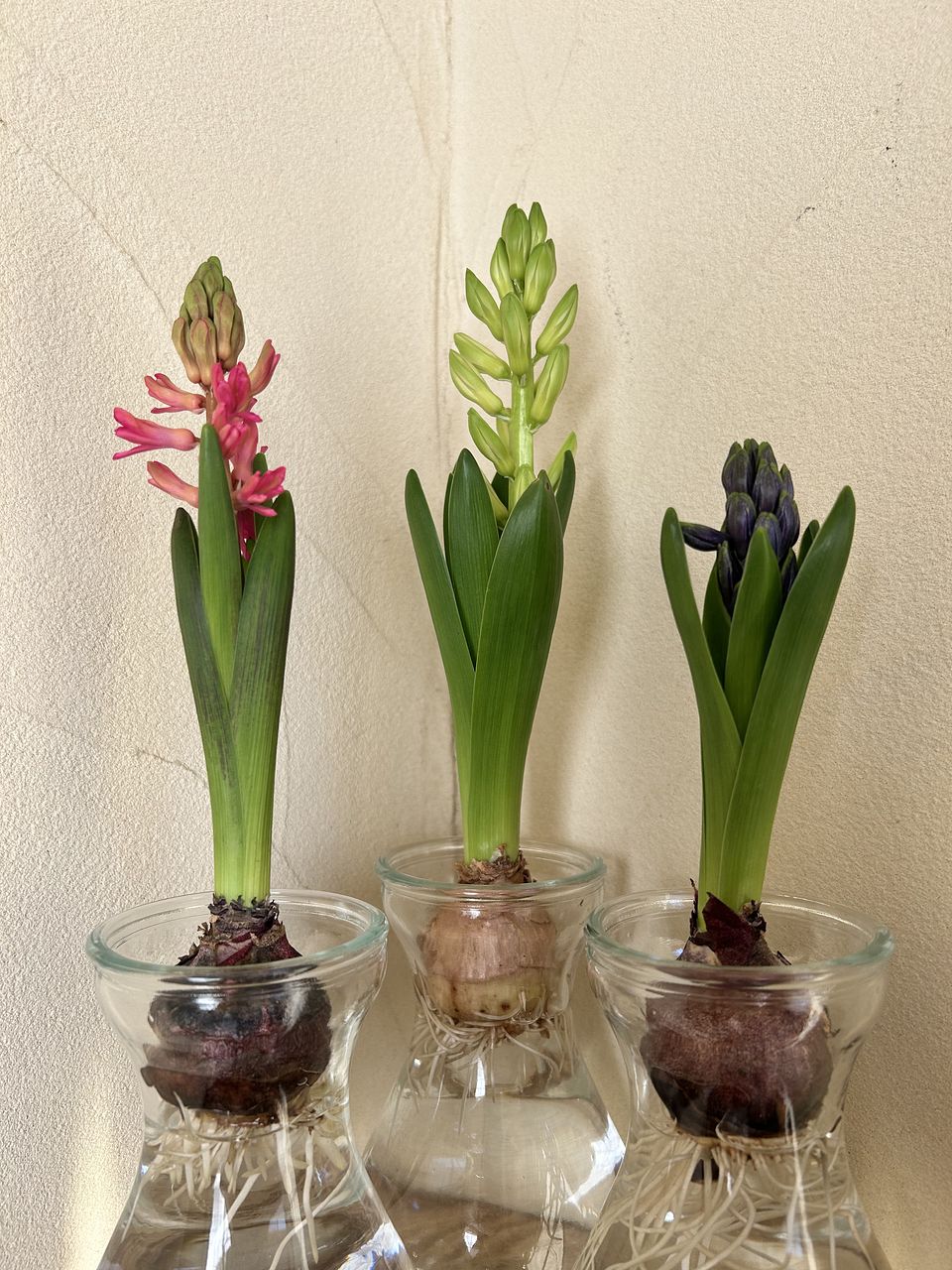 ヒヤシンスを育てるのは初めてです。 3つそれぞれどんな色のお花が咲くのか楽しみです。