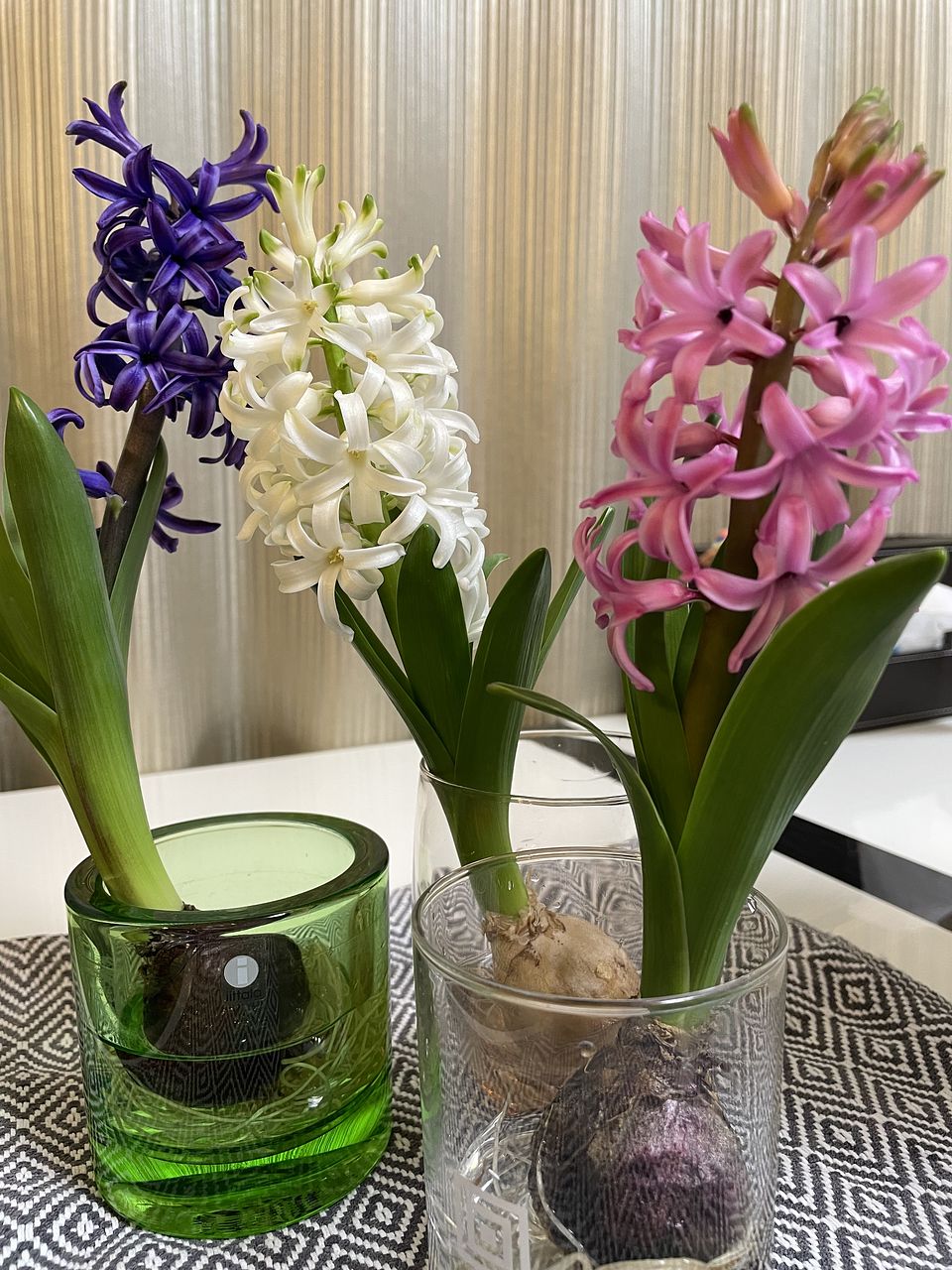 ヒヤシンスの水栽培は、小学生の頃以来です。 毎日観察するのが楽しかったです。スクスク伸びて、綺麗に咲きました。