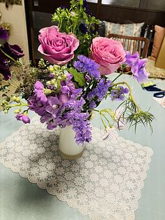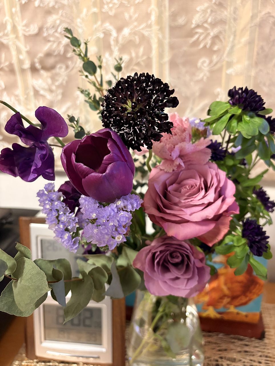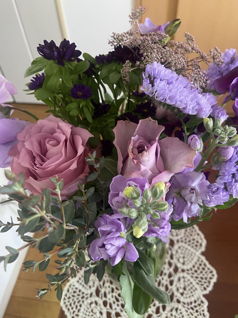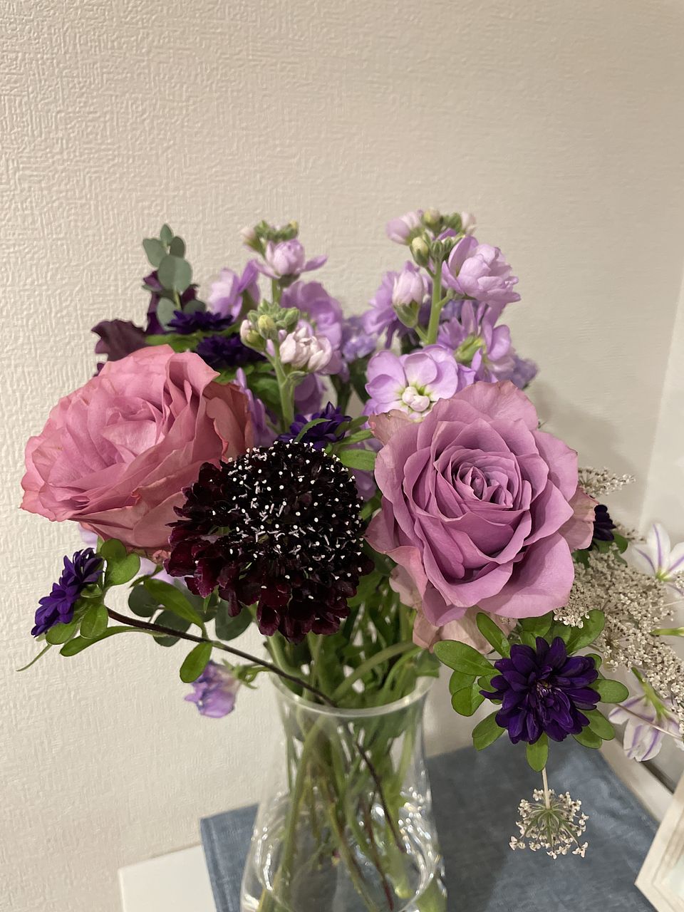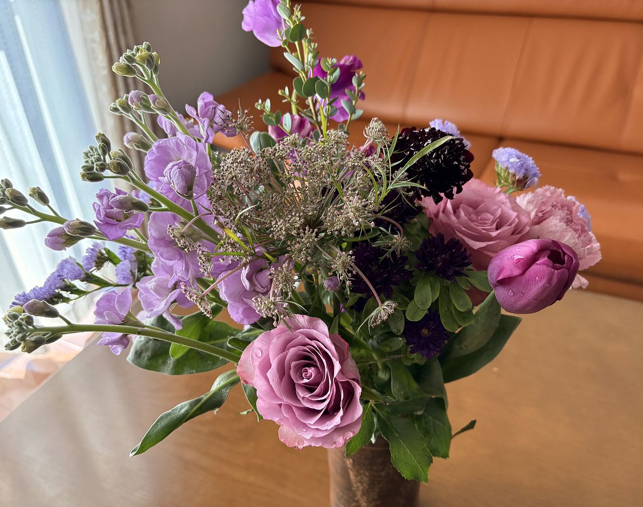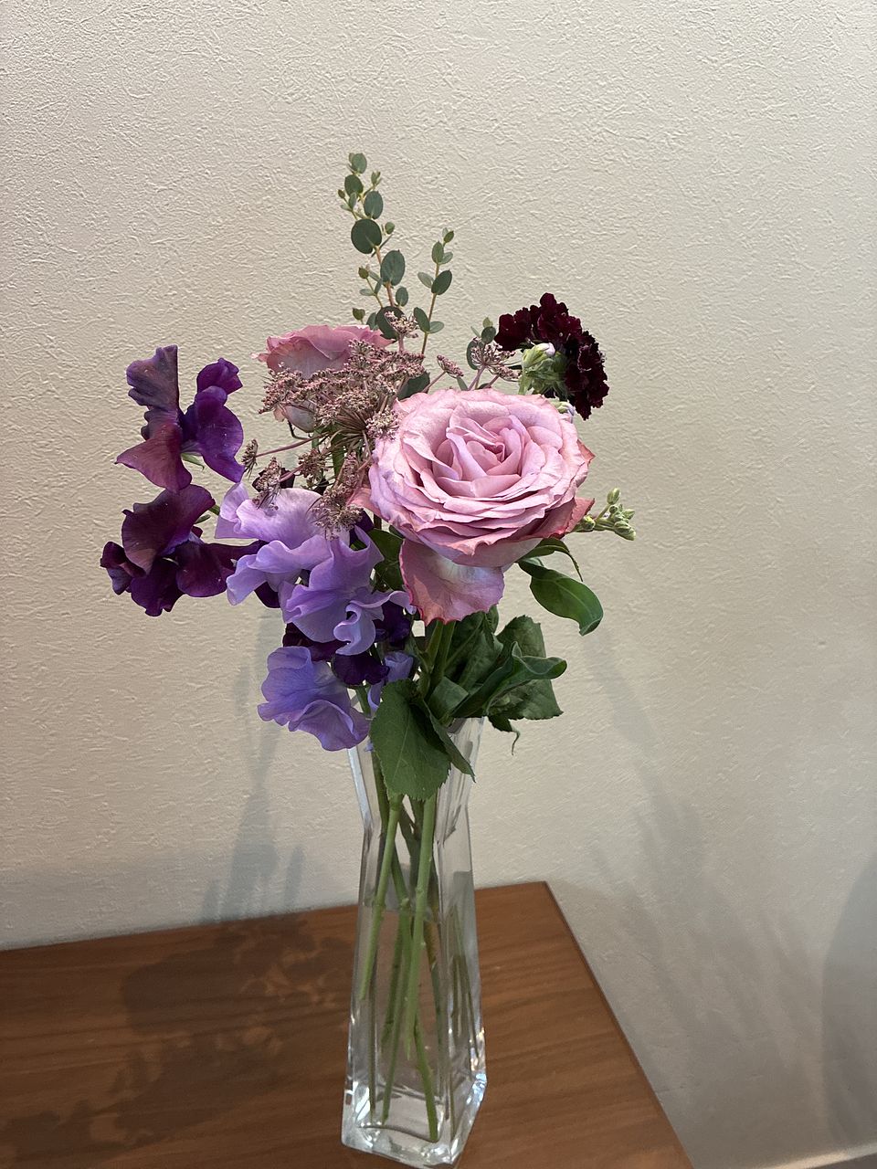 ばら、チューリップ、ストック、スイートピー、フリージア、スターチス、アスター、レースフラワー、ユーカリなど盛りだくさんでボリュームがありました。レースフラワーは今まで見たことがない色味のシックな感じでしたし、とても満足です。