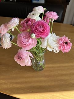 ピンク系のラナンキュラスが可愛いです。到着した時は満開ではなかったのでボリューム少ないかなと感じましたが、開花するにつれてボリュームが出てきました。見たことがない品種のものも入っていて楽しいです。